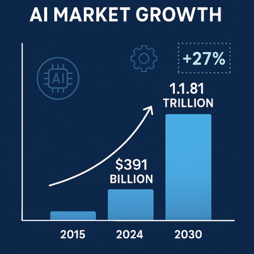Thị trường AI toàn cầu đã trải qua sự tăng trưởng phi thường trong thập kỷ qua. Từ quy mô khiêm tốn vào đầu những năm 2010, thị trường AI hiện được định giá khoảng 391 tỷ USD năm 2024 và dự kiến sẽ đạt 1.81 nghìn tỷ USD vào năm 2030, tương ứng với tốc độ tăng trưởng kép hàng năm (CAGR) là 35.9%. Con số này không chỉ phản ánh sự quan tâm của nhà đầu tư mà còn cho thấy nhu cầu thực tế ngày càng tăng đối với các giải pháp AI trong mọi ngành nghề.