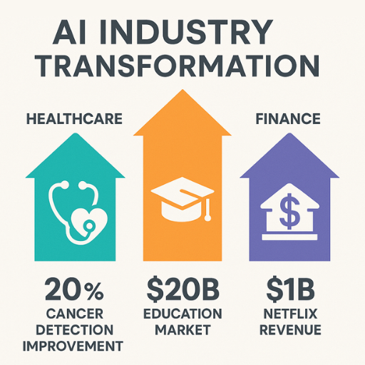 Tác động kinh tế của AI trong dịch vụ tài chính là đáng kể. Chỉ riêng Netflix đã kiếm được 1 tỷ USD hàng năm từ các đề xuất cá nhân hóa tự động. 48% doanh nghiệp sử dụng một số hình thức AI để tận dụng dữ liệu lớn một cách hiệu quả, và 38% nhà cung cấp y tế sử dụng máy tính như một phần của quá trình chẩn đoán.