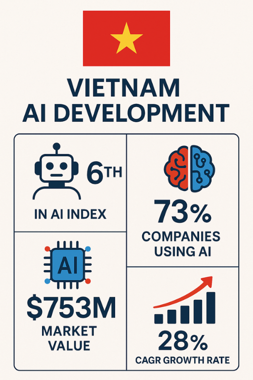 Thị trường AI của Việt Nam được định giá 753 triệu USD năm 2024 với tốc độ tăng trưởng kép hàng năm là 28% từ 2024-2030. Điều đáng chú ý là Việt Nam đã đạt vị trí thứ 6 trong số 40 quốc gia trong Chỉ số AI Thế giới 2025, đánh dấu lần đầu tiên Việt Nam lọt vào top 10 toàn cầu về nhận thức và sự sẵn sàng áp dụng AI. Việt Nam đứng thứ 3 toàn cầu về mức độ tin tưởng AI với 65.6 điểm và thứ 5 về mức độ chấp nhận AI với 71.6 điểm.