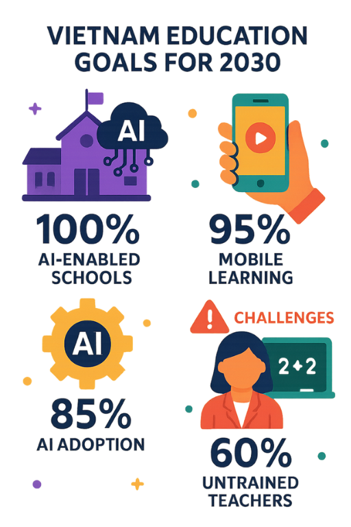 Theo kế hoạch của Chính phủ, đến năm 2030, 100% cơ sở giáo dục phổ thông sẽ triển khai hệ thống quản lý giáo dục dựa trên AI nhằm theo dõi học tập và dự báo chất lượng học sinh. Điều này đòi hỏi sự đầu tư mạnh mẽ vào cơ sở hạ tầng công nghệ và đào tạo nguồn nhân lực.