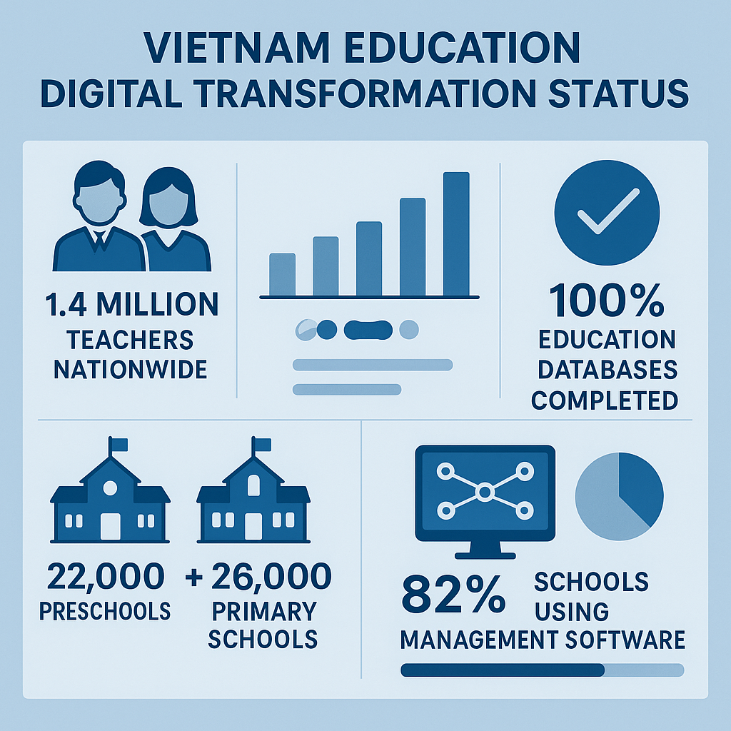 Việt Nam đang trải qua giai đoạn chuyển đổi số giáo dục toàn diện và sâu sắc nhất trong lịch sử. Theo báo cáo của Bộ Giáo dục và Đào tạo, đến nay cả nước đã hoàn thành xây dựng 100% các cơ sở dữ liệu của ngành giáo dục, bao gồm cơ sở dữ liệu giáo dục mầm non với gần 22.000 cơ sở giáo dục và cơ sở dữ liệu giáo dục phổ thông với hơn 26.000 cơ sở giáo dục. Quá trình số hóa đã được thực hiện với gần 24 triệu hồ sơ học sinh và hơn 1,5 triệu hồ sơ giáo viên, nhân viên và cán bộ quản lý từ 53 nghìn trường học trên toàn quốc.