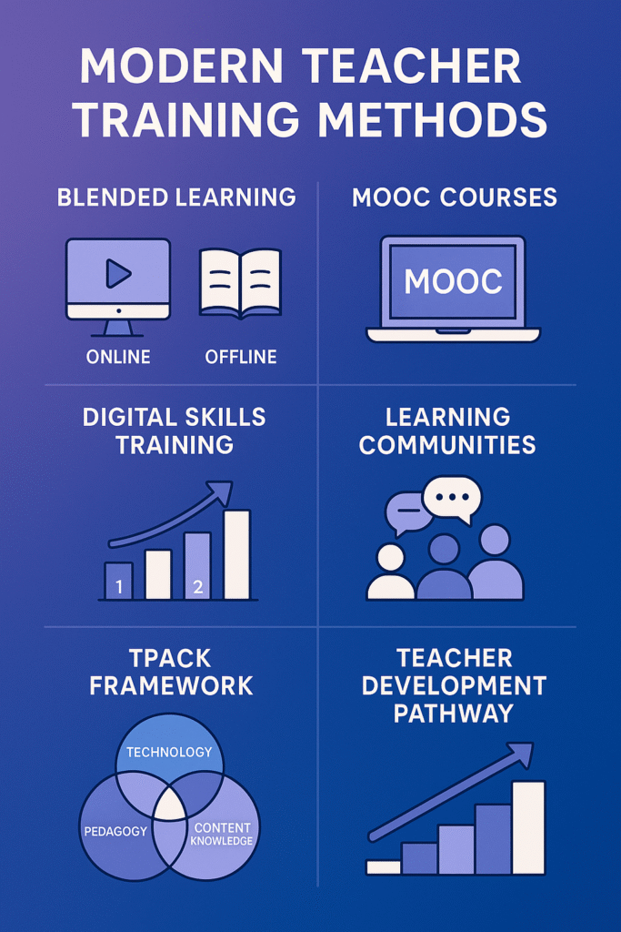 Hình thức học tập kết hợp (blended learning) giữa trực tuyến và trực tiếp đang được nhiều địa phương triển khai hiệu quả. Các lớp tập huấn trực tiếp do chuyên gia công nghệ số hướng dẫn giúp giáo viên tiếp cận và thực hành ngay với các công cụ, phần mềm hỗ trợ giảng dạy. Bên cạnh đó, việc học tập trực tuyến thông qua các khóa học MOOC (Massive Open Online Courses) giúp giáo viên chủ động tiếp thu kiến thức theo lịch trình cá nhân.