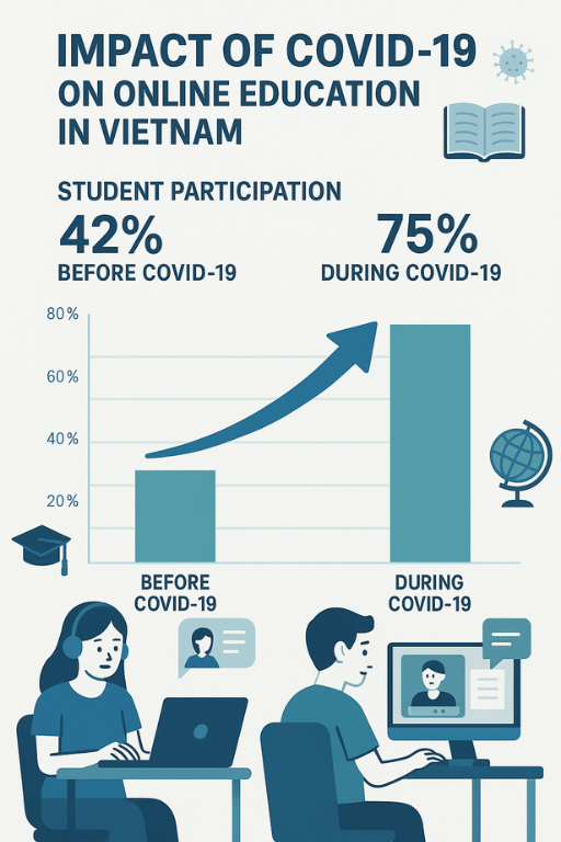 Đại dịch COVID-19 đã trở thành bước ngoặt lịch sử đối với giáo dục trực tuyến Việt Nam. Theo số liệu từ các nghiên cứu, tỷ lệ học trực tuyến của sinh viên Việt Nam đã tăng từ 42% năm 2019 lên 75% năm 2021, đặc biệt là sự gia tăng đột phá lên 61% vào năm 2020.