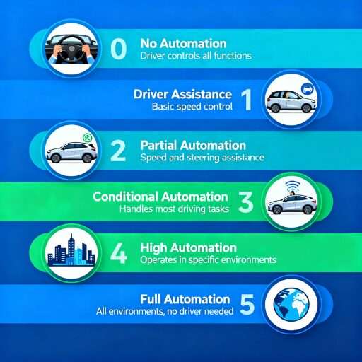 Xe tự lái được phân loại theo hệ thống 6 cấp độ của Hiệp hội Kỹ sư Ô tô (SAE International), từ cấp độ 0 không có tự động hóa đến cấp độ 5 tự động hoàn toàn. Hiện nay, phần lớn các phương tiện trên thị trường đạt cấp độ 2, nơi xe có khả năng tự điều khiển cả vô lăng và tốc độ trong một số điều kiện nhất định, nhưng người lái vẫn phải duy trì sự tập trung.​