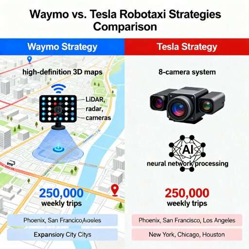 Tesla theo đuổi chiến lược khác biệt với việc bắt đầu dịch vụ robotaxi thử nghiệm tại Austin vào tháng 6/2025 dành cho một nhóm người hâm mộ được chọn lọc. CEO Elon Musk tuyên bố rằng dịch vụ sẽ có thể tiếp cận “một nửa dân số Mỹ” vào cuối năm 2025. Chiến lược của Tesla dựa trên việc sử dụng hệ thống chủ yếu dựa vào camera và AI, cho phép mở rộng nhanh hơn mà không cần công việc lập bản đồ chi tiết và chuẩn bị kỹ lưỡng như Waymo.​